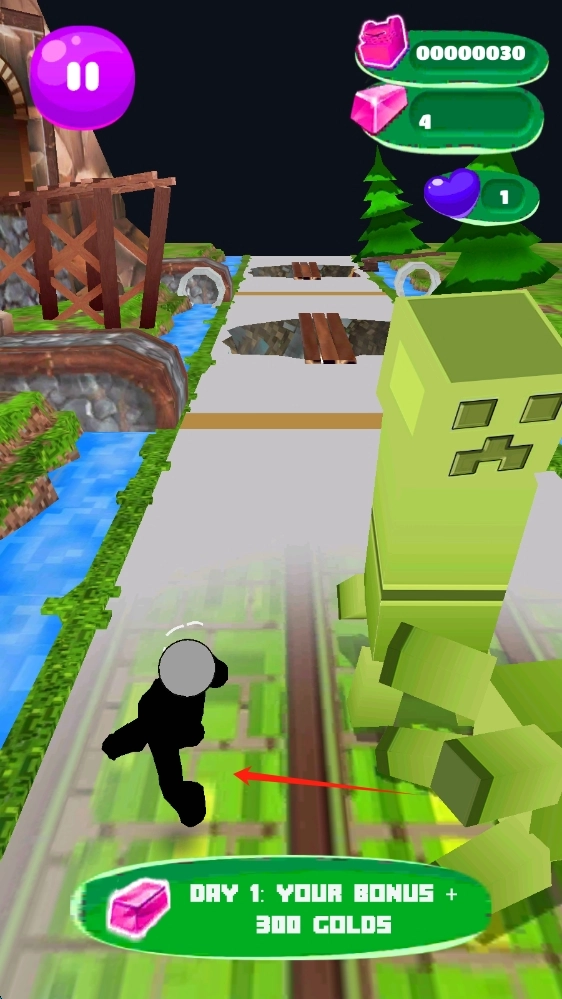 在跑酷界面中,你需要操控火柴人亨利,让他在轨道上灵活奔跑,避开绿色怪物,收集沿途的物品,通过滑动来移动人物。