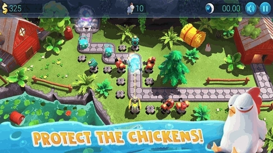 鸡塔防御离线游戏是一款以卡通风格的农场为背景的街机风策略塔防游戏。在游戏中,玩家将化身为农场主,为了守护自己的农场不被外星人侵占,保护辛苦养殖的小鸡不被吃掉,需要勇敢地展开反击。通过策略性地布置各类炮塔,制定出最有效的战术,准备发起攻击,消灭来犯的敌人。