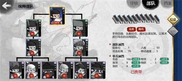 ②军师和策士的输出以及普攻都是按策攻计算的,军师的爆发能力很强,在阵容搭配中可以推荐大部分位置都带上,建议军师和都督这两个兵种各占一半的比例。