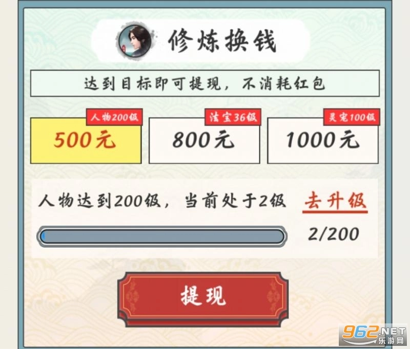提现500元需满足人物等级达到200级,提现800元需满足游戏法宝等级达到36级,提现1000元需满足游戏灵宠等级达到100级。