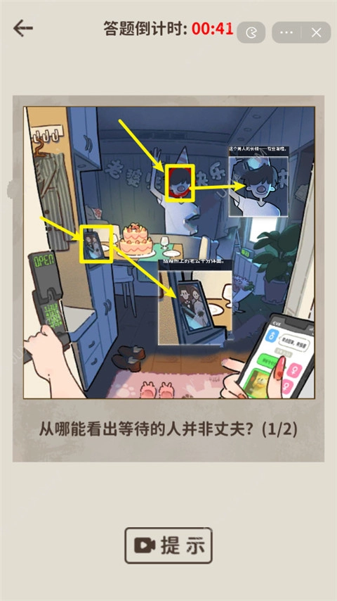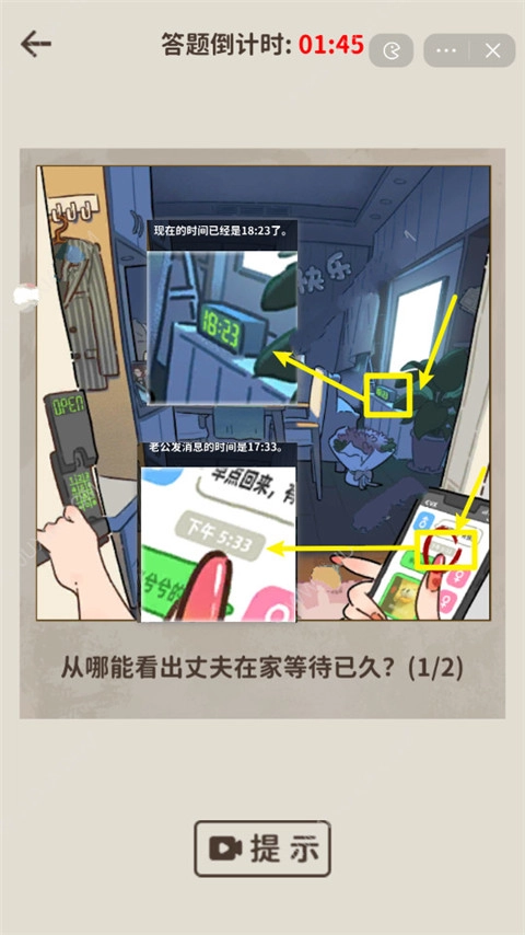 从哪里可以看出丈夫已经在家等待很久了呢?可以点击妻子手中手机屏幕里的【聊天时间】;还能点击房间里电视下方的【闹钟】。