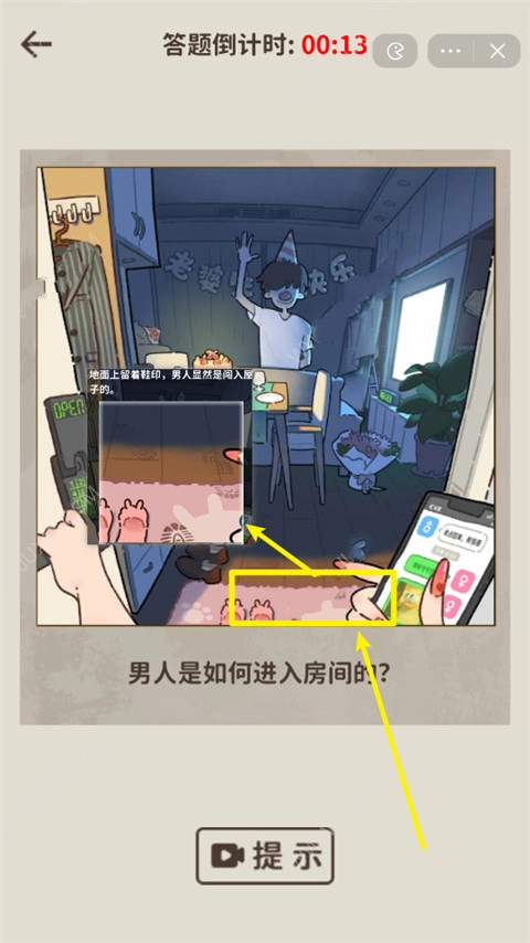 男人是怎么进到房间里的呢?点击门口地毯上的脚印,就能知道他是硬闯进来的。