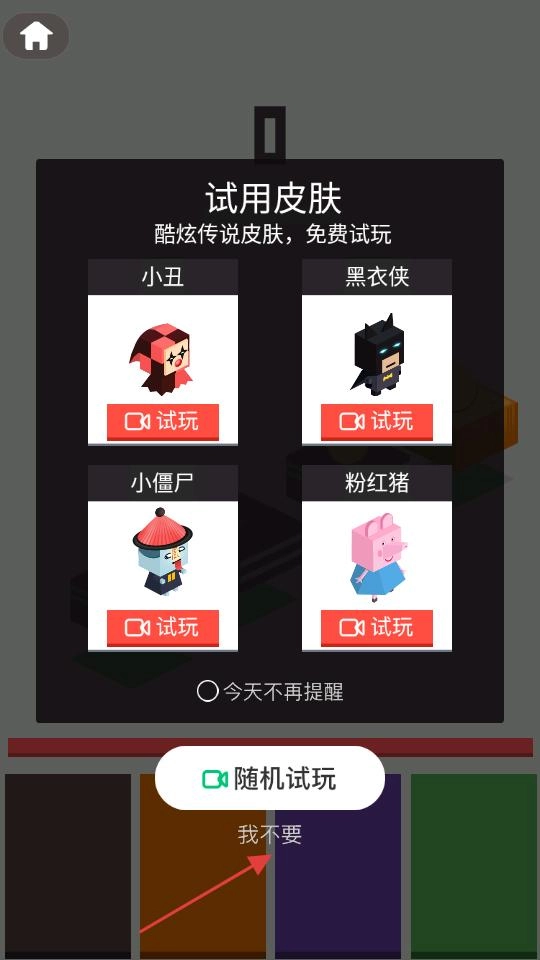 进入游戏后,可能会弹出皮肤试用界面,界面展示了小丑、黑衣侠、小僵尸、粉红猪四款皮肤,都能免费试玩,若不想试用,可点击我不要按钮,关闭该界面。