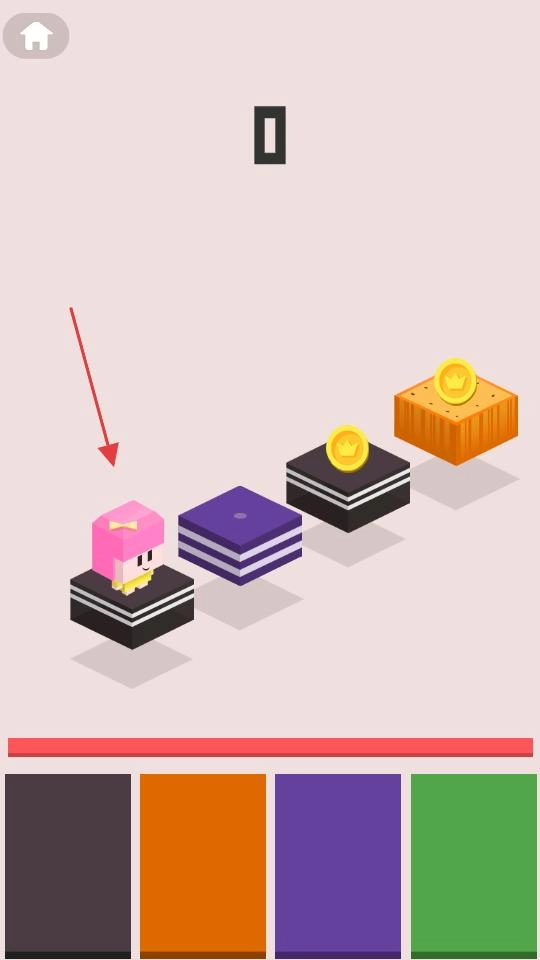 用手指触碰屏幕,小英雄就会开始蓄力准备起跳。你需要根据角色和目标台阶之间的距离来控制触屏的时长——触屏时间越久,小英雄就能跳得越远。等你松开手指,它就会朝着台阶的方向一跃而去。