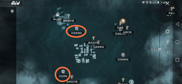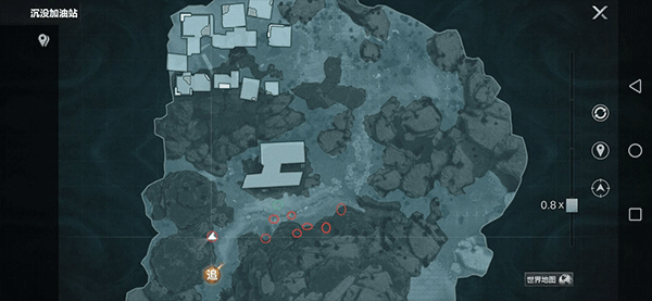 下面这张图里,红圈标出来的位置,就是沉没加油站里花岗岩的刷新点。(绿圈标注的是气泡海鞘的位置)接着结合刷新点之间的距离、往返的路程还有物资刷新的时间,我建议各位净化者按照下面这条路线来挖矿。
