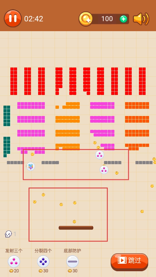 发射小球时,可以借助道具来提升消除方块的效率,比如让小球分裂;与此同时,还得留意躲避危险元素,防止游戏失败。
