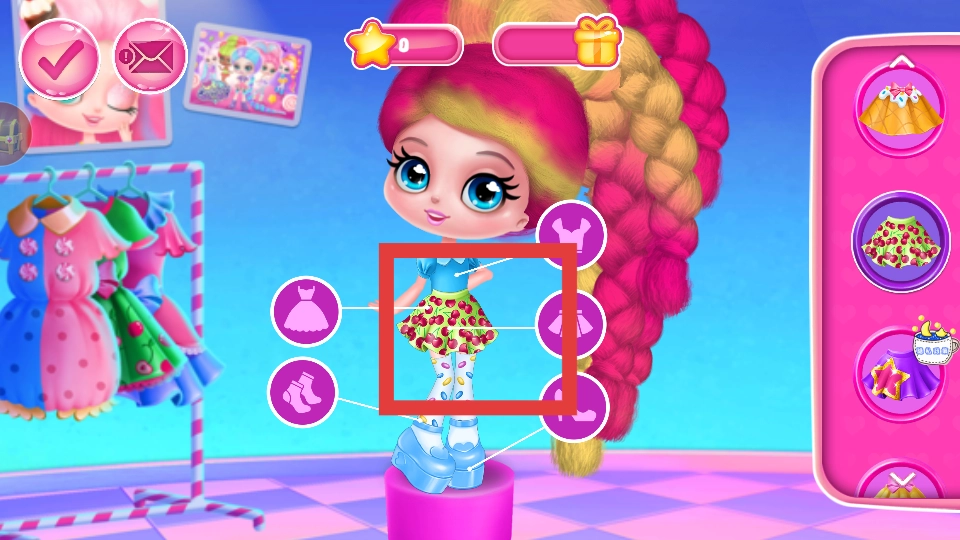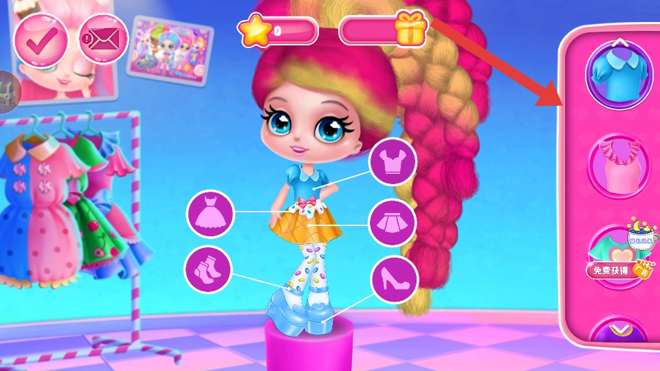 在服饰搭配环节,点击右侧粉色区域的各类服饰图标,即可自由组合不同款式,打造出甜美、优雅等各种风格的穿搭造型。