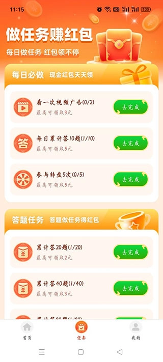 除了前面提到的答题赚钱,还有多种任务可供完成,完成每日任务的话,会有源源不断的惊喜