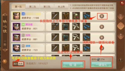 每个弟子可穿戴四件装备(武器、衣服、头盔、鞋子),装备可在炼器房消耗精铁来打造,八荒强化图纸可提升武器等级上限,地图探索中战胜威望怪可随机获得高等级装备和强化图纸。队伍装备打造、升级、调整可参考以下界面: