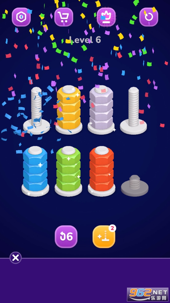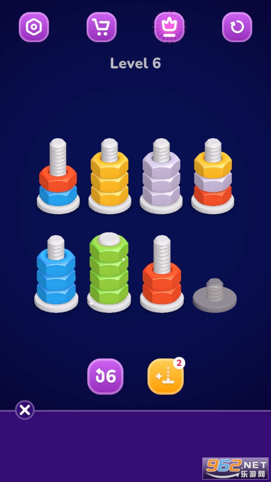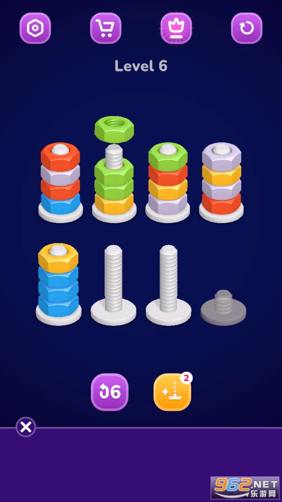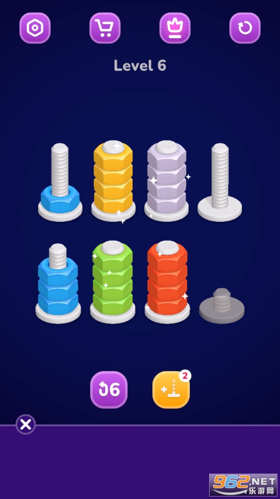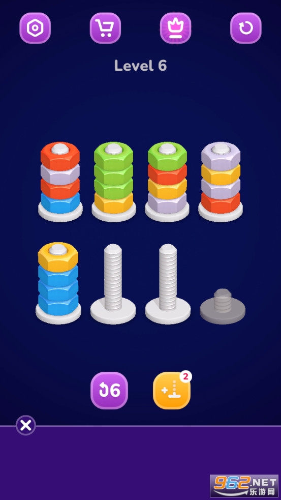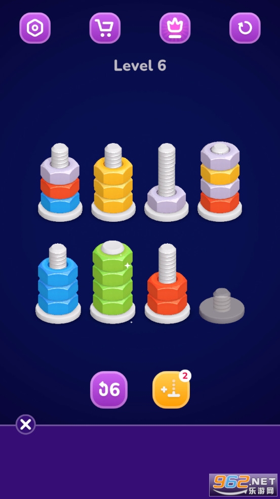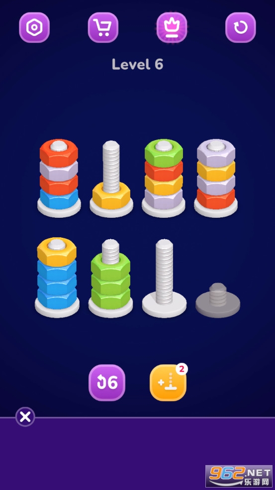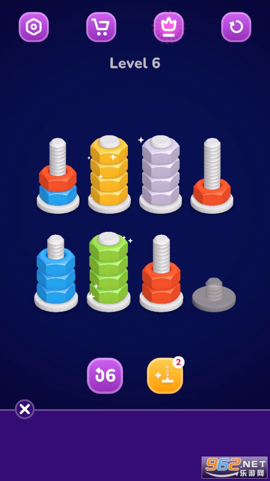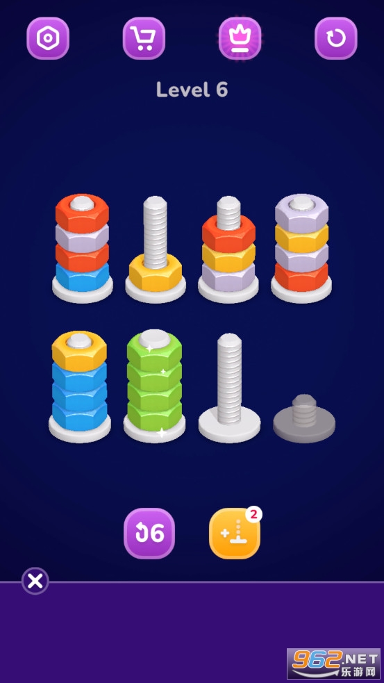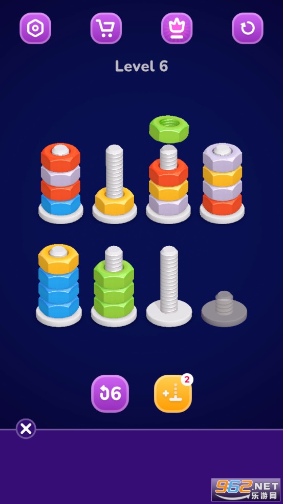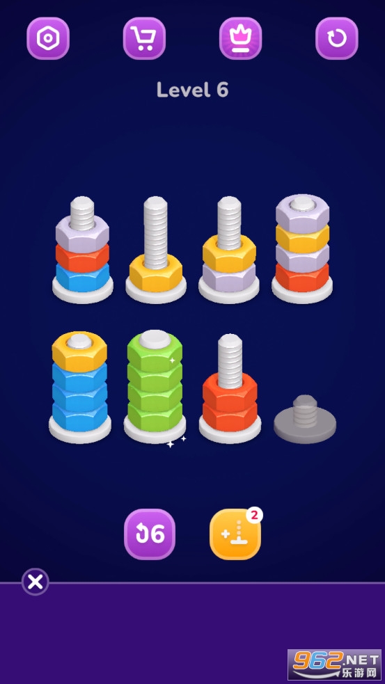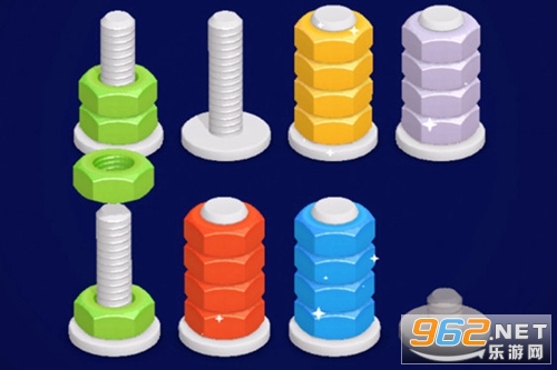 只能把相同颜色的移动到另一个相同颜色的螺母上,最终让所有相同颜色的都集中在一起