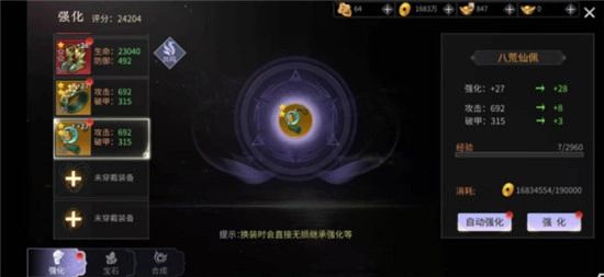 装备加成方面,玩家身上穿戴的8种不同装备都具备较大的战力提升空间。相同种类的高阶装备可直接合成升星升级,以此额外增加大量战力——每三件低星装备能合成更高星的装备,当装备升满3星后,即可提升其阶段。此外,升级同样是装备提升的重要方式,尽管升级需要消耗大量铜钱,但铜钱在游戏内的获取速度也较快。