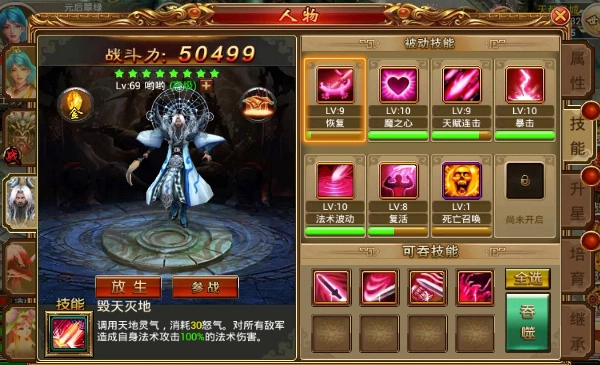 魔神召唤:消耗100点怒气,对所有敌方单位造成基于自身法术攻击与法术伤害的伤害效果,同时使敌军在接下来的2回合内物防与法防降低。