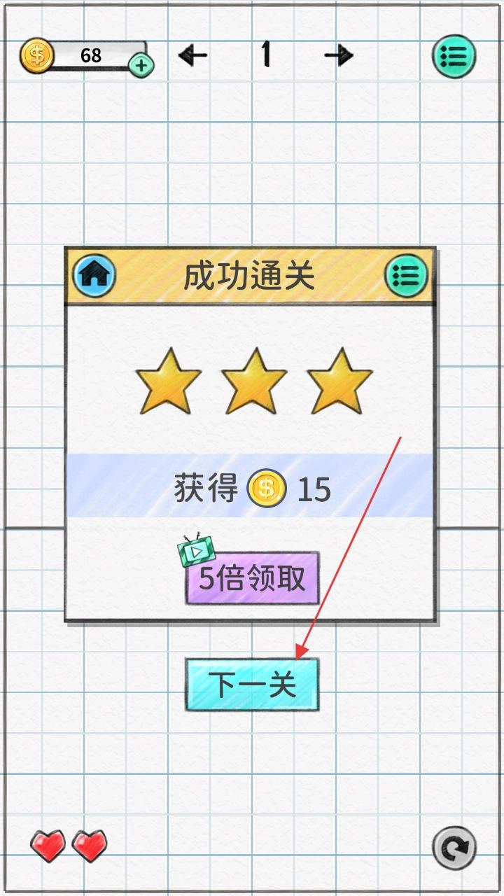成功通过关卡后,会弹出提示界面显示通关成功,同时获得三颗星的评价以及15枚金币奖励;点击界面上的“下一关”按钮,即可进入新的关卡继续挑战。