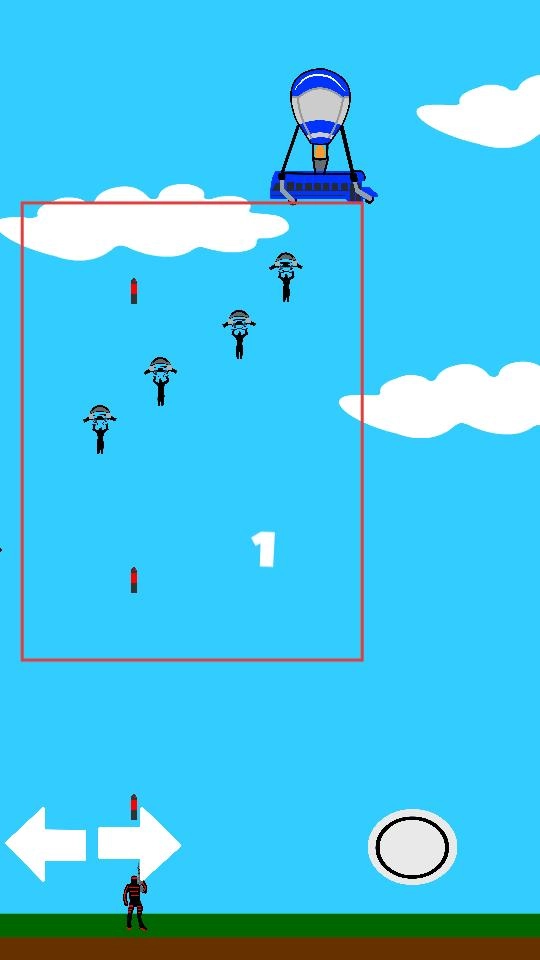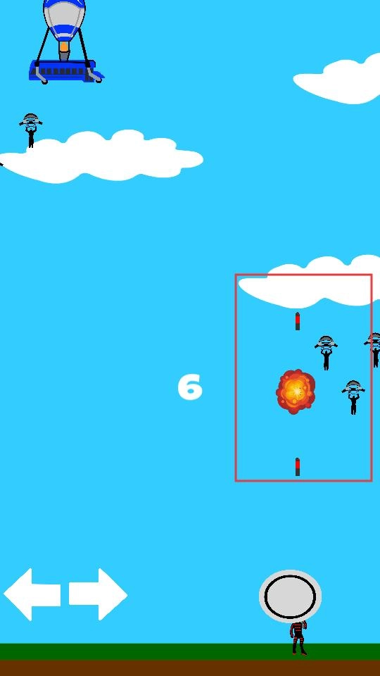 通过左右箭头操控角色横向移动,点击圆形按钮进行射击,消灭从热气球上跳下的敌人,避免敌人到达地面。