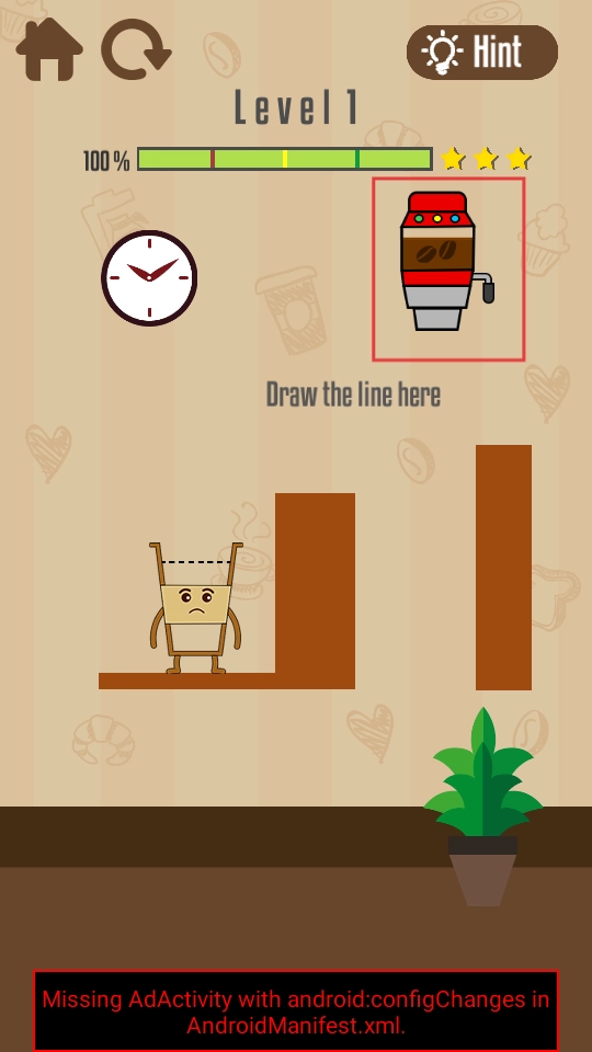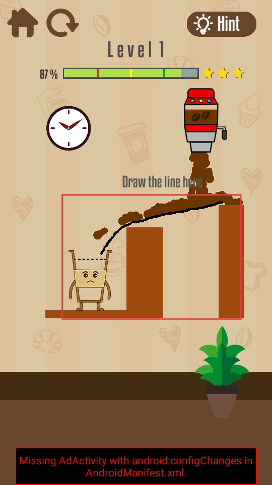 在“Draw the line here”区域,用手指画出线条,引导咖啡机流出的咖啡绕过障碍,流进下方的杯子里,线条需要覆盖咖啡的流动路径。