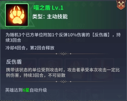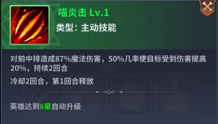 火焰喵的喵炎击技能可增强队伍的整体输出能力,而被动技能热血狂潮搭配齐天大圣以及主动技能喵之盾,能切实提升队伍的续航效果。
