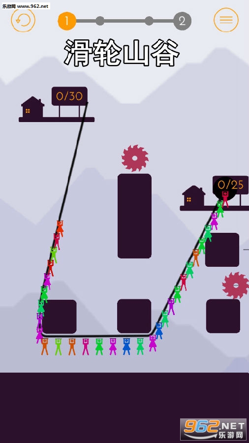 《滑轮山谷》是一款画面清新、玩法类似绳索救援的趣味冒险闯关游戏。在游戏里,玩家要在两个平台之间用绳索连接起来,同时得避开齿轮之类的危险。通过点击屏幕,能让小人一个接一个快速下滑,最终到达对应的平台上。
