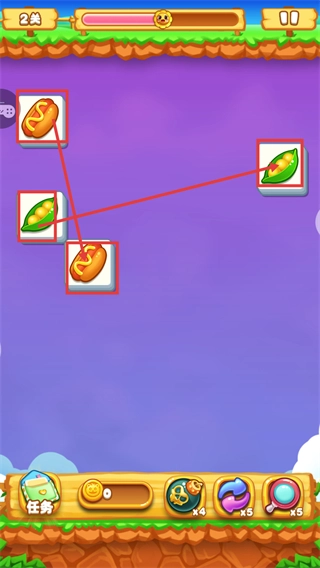 3、优先匹配相同的【热狗】【豌豆】这类物品,借助连线消除来积累进度,要留意物品的分布区域。