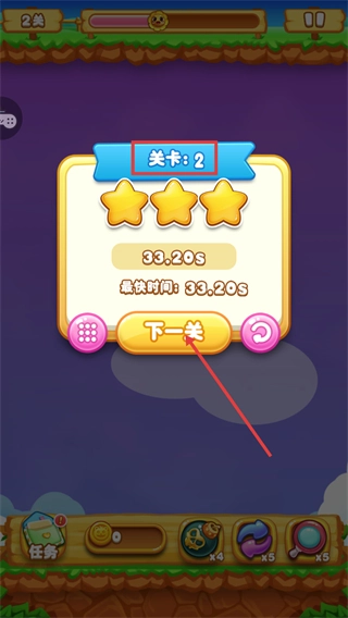 4、完成关卡后可获得【三星】评价与【33.20s】的最快通关时间记录,点击【下一关】继续挑战,进一步提升消除效率。
