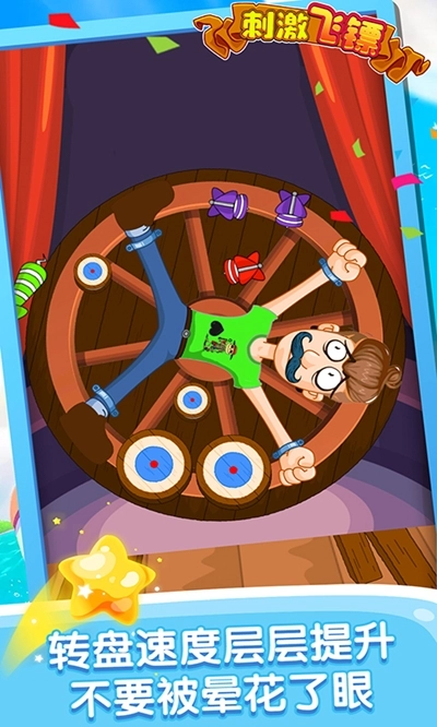玩家朝着一个旋转的转盘投掷飞镖,击中转盘上的各类靶子。随着关卡的推进,转盘的转速会越来越快,还会出现形形色色的奇特靶子。需要注意的是,转盘上除了靶子之外,还有马戏团老板,千万别射错目标!
