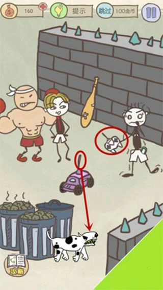 首先点击史小坑的背包,让药剂掉落出来,接着把药剂拖到狗的身上,这样就能顺利过关了。