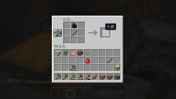 接下来我们把煤和木棍组合起来,就能合成四个火把。火把能给我们提供光源,要是亮度不足的话,就会有可怕的怪物出现攻击我们,所以我们在挖矿的时候得记得随时带上木棍和煤,在矿道里一边开采一边插上火把,这样才能确保自身安全。