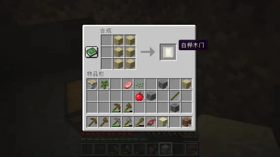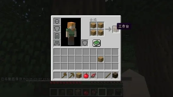 我们拉开背包,借助合成栏制作出一个工作台,它能协助我们合成各类工具以及更多方块类物品。
