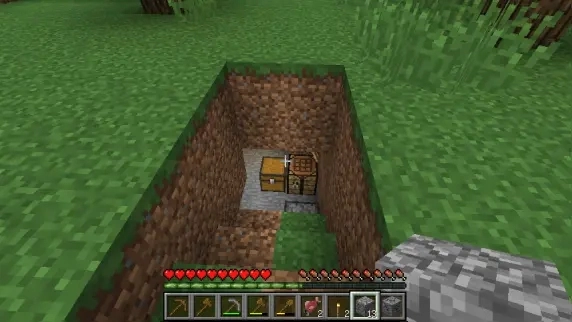 需要注意的是,挖掘矿洞时最好开凿出阶梯,这样便于我们后续往返。从图中能看到石头,现在就用木镐来开采一些石头吧!
