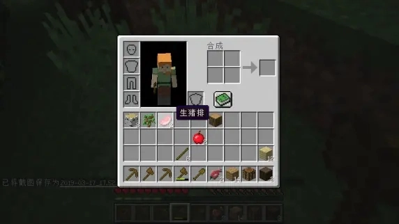所以,我们得学会自保,还得按时好好吃饭。物品栏上方右侧的鸡腿栏代表的是饥饿度,不管是开采矿物、砍伐树木,还是跑步游泳,这些行为都会消耗饥饿度。要是我们太饿了,不仅没法奔跑,严重时还会掉血甚至危及生命,所以一定要保证饮食。不过要注意避开变质、有毒或者生的肉制品,这类食物会产生很多负面影响。因此,我们先把猪排暂时存放在背包里。