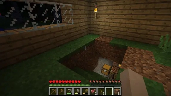 现在,我们在刚修缮好的小矿洞里头插上几根火把,接着回到地面。