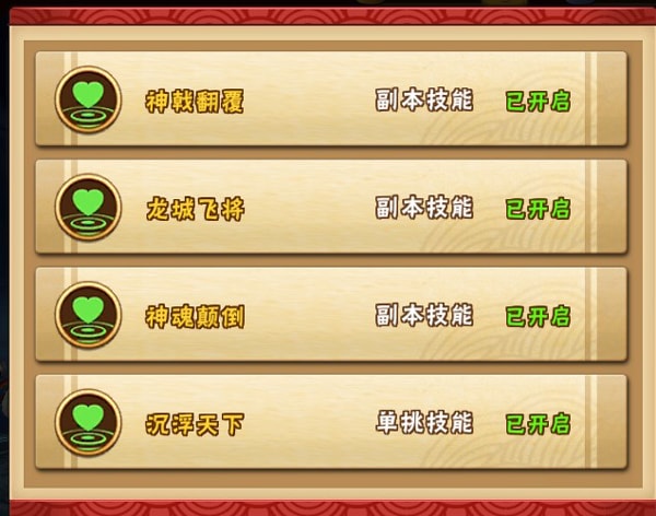 神戟翻覆: 副本战斗时手动释放,主动对范围内所有目标造成一次30%的伤害,同时使敌人陷入眩晕状态,该效果持续6秒。2:龙城飞将: 副本战斗时会概率触发该效果,触发后将以被动形式对范围内的9个目标进行嘲讽
