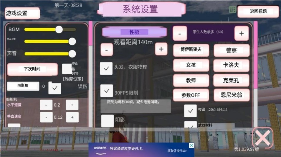 在游戏里也能对系统进行设置,像学生数量上限设为60人、观看距离设定为140米之类的都可以调整。