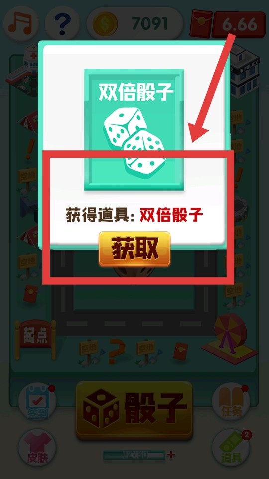 完成任务后,界面会弹出双倍骰子道具的提示,点击“获取”按钮即可获得该道具,它可用于后续的投掷操作。
