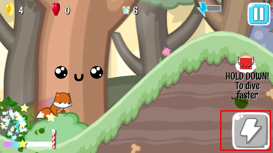 游玩时,长按右侧的闪电图标按钮,角色就能立刻进入加速滑行状态,更迅速地穿梭在林间,尽情体验刺激的滑行过程。