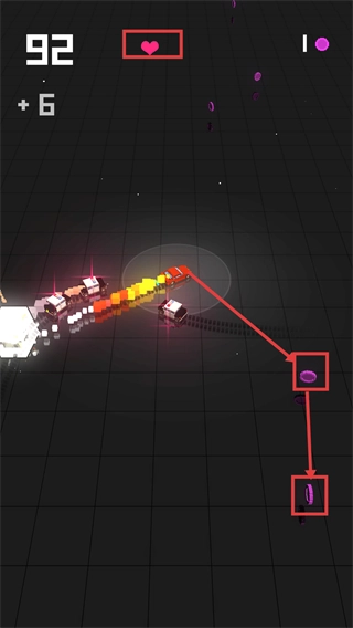2、赛道内分布紫色代币与生命回复道具,代币可在商店解锁新车辆,道具助力突破围剿困境,丰富资源使用的策略性。
