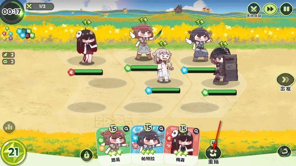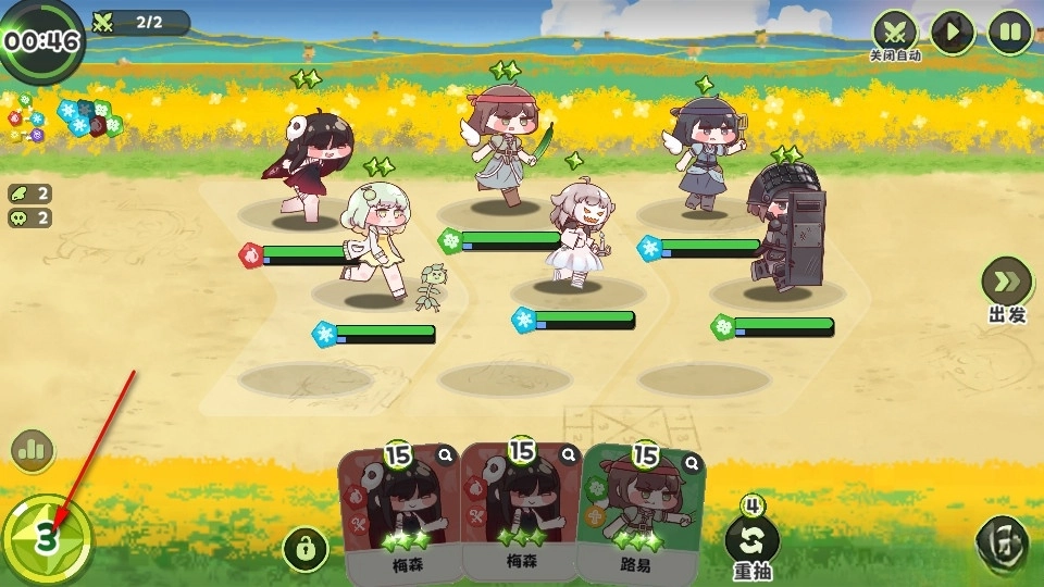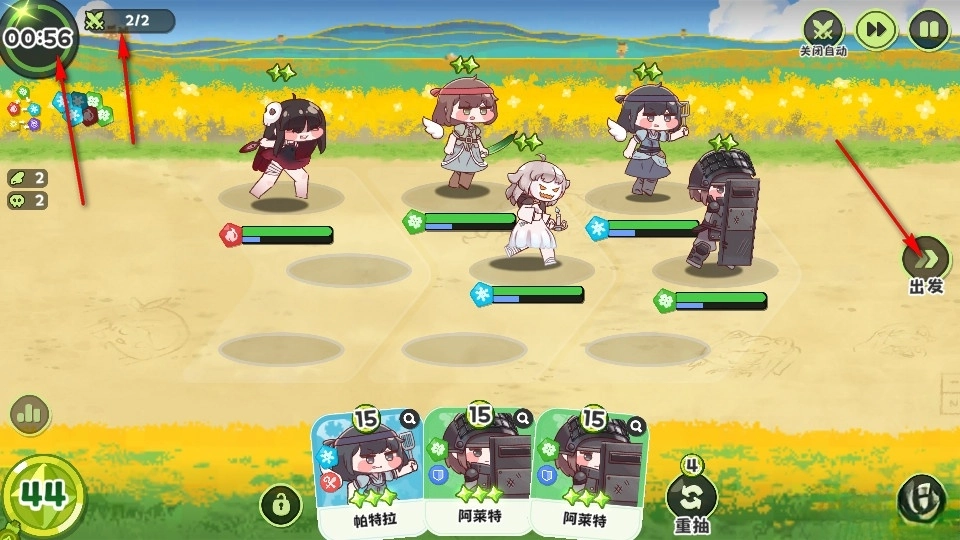左上角会显示剩余时间,时间一到就会自动出发;同时这里也标注了不同属性的克制关系,能为玩家提供属性克制的参考。等准备就绪后,大家就可以选择出发了。
