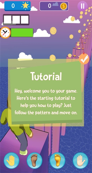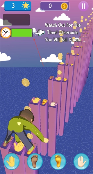 进入游戏后,你需要操控角色在分布着金币与各类标识的柱子间移动;要留意屏幕上的时间提示,防止角色因时间耗尽而掉落,并且在此过程中收集金币。