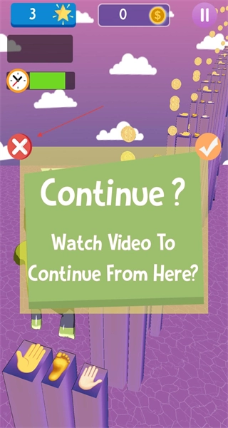 游戏进行中若遇突发状况,系统将弹出带有提示文字的继续提示界面,玩家可依据提示选择是否观看视频以延续游戏,此选择将决定后续的游戏进程走向。