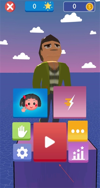 打开沙雕跳一跳,进入初始界面,这里设有多个功能按钮,同时显示星星与金币的数量,点击红色的开始按钮后,即可进入游戏教程页面。