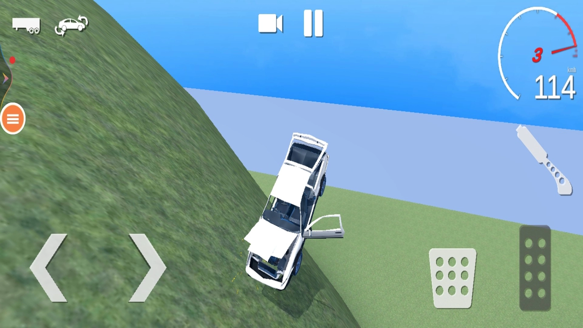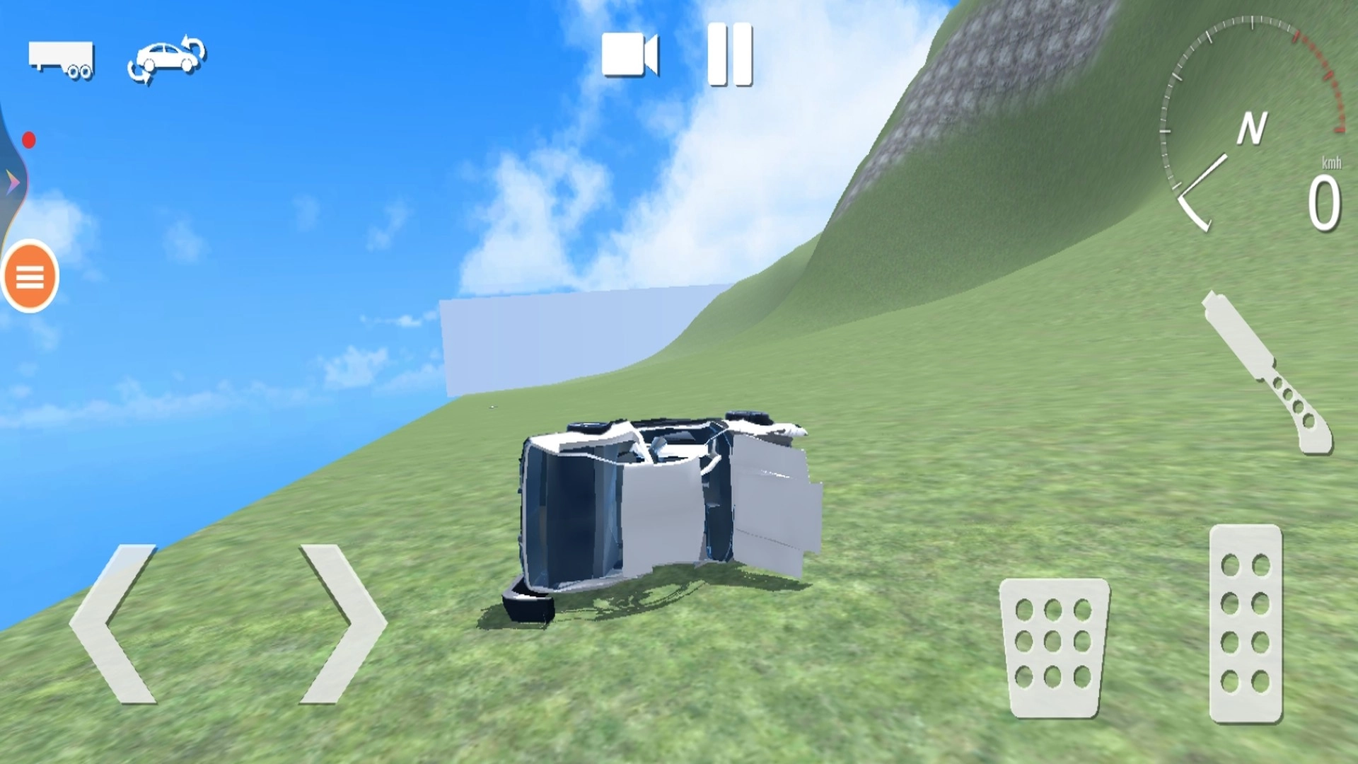 通过虚拟按键操控汽车的转向、油门与刹车,在特定场景中驾驶,冲越山坡、驶过弯道,达成碰撞相关的任务。