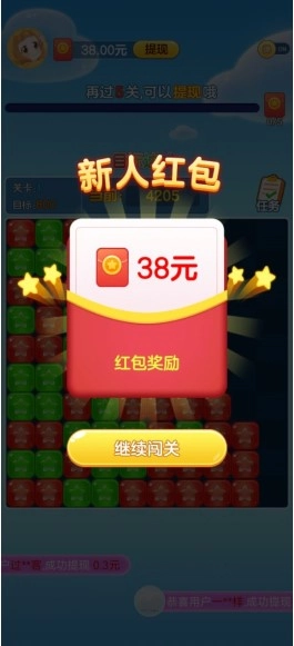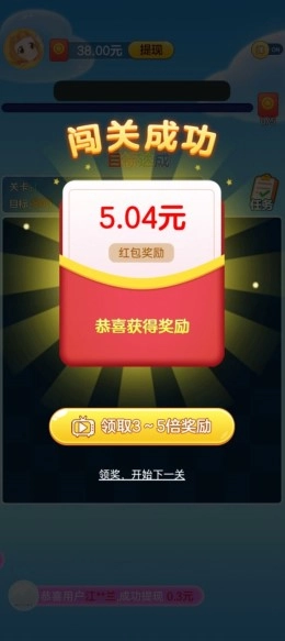 玩家完成通关后,就能领取38元的新手红包奖励。