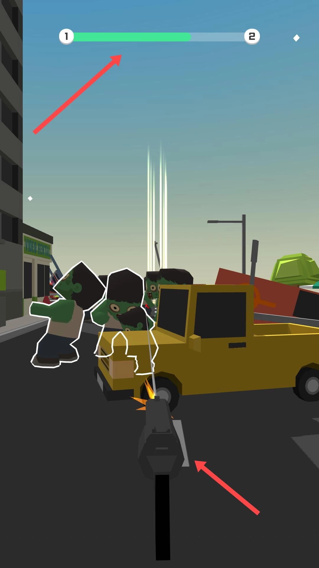 当面对多只僵尸时,要留意上方的进度条,通过移动来调整射击角度,优先对靠近的僵尸发起攻击,借助火力压制的方式,不断推进关卡进度。