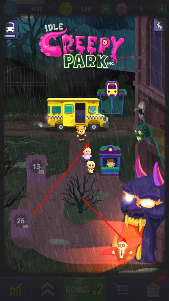 当遇到大蛇这类怪物时,要采取合理的应对方式,点击BONUS x2增益效果,击败怪物后就能推进关卡,进而解锁更多的区域。