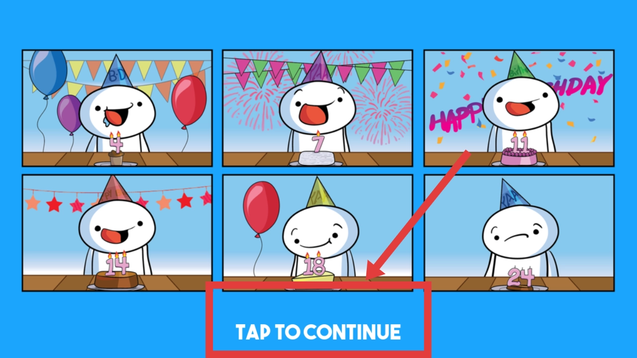 进入画面后,会看到角色在不同年龄段的生日场景,点击下方的“点击继续”按钮,即可推进故事流程。