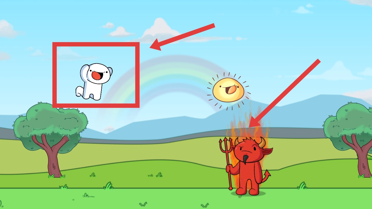场景切换至户外区域,玩家需操控白色角色进行移动,过程中要避开红色恶魔的追击,同时与太阳元素展开互动,接着在彩虹色的草地上探索并持续前进。