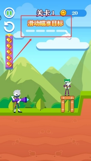 通过手指在屏幕上滑动来调整射击角度,留意弹道的预判线以精准命中敌人,当所有目标都被击败后就能进入下一个关卡。