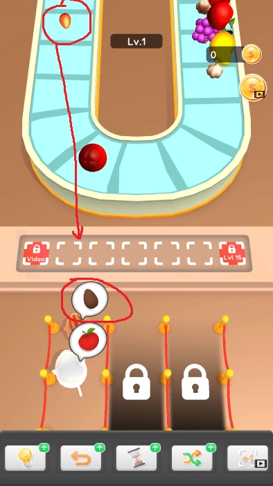 得等前面的小猫离开,才能给下一个选水果;后面关卡水果变多,就容易点错了。