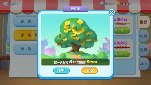 温馨提示:隔壁摇钱树5*20可兑换100钻石或1W金币,相比之下,优先选购商城的金币礼包会更为划算。
