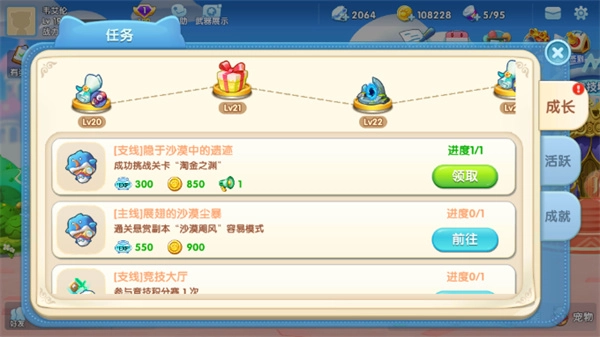 说明:成长、活跃、成就任务都有大量的金币奖励哇,还能获取大量的经验=。=记得做哦