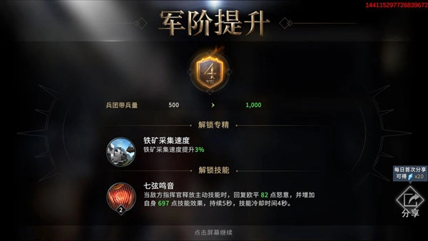 领主点击已解锁的指挥官,就能打开指挥官界面。在该界面的右侧,可查看军阶提升的相关信息。